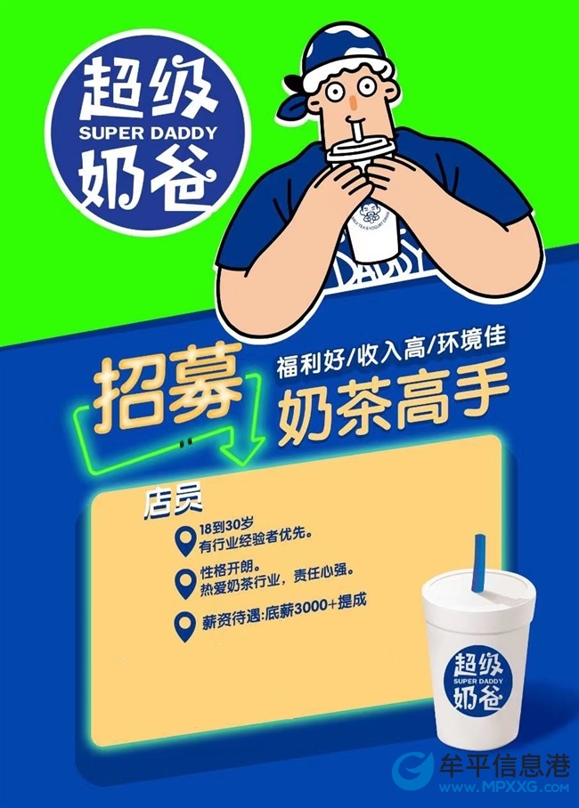 **奶爸即將入駐西關(guān)夜市,誠招熱愛茶飲的小哥哥小姐姐們,有奶茶店工作經(jīng)驗(yàn)者優(yōu)先,舒適自由的工作環(huán)境氛圍 ,誠邀你的加入,有意的聯(lián)系,微信同手機(jī)號
